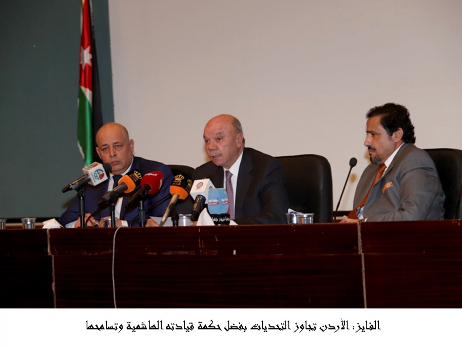 وقال إن الأردن اليوم يواجه تحديات أمنية وسياسية بسبب موقعه الجيوسياسي، ولعل أبرزها، صفقة القرن، التي تتحدث عنها الإدارة الأميركية، مؤكداً أن الاردن مازال قوياً سياسياً وأمنياً، رغم التحديات الاقتصادية التي أغلبها خارجة عن إرادتنا ومنها اللجوء السوري، واغلاق الحدود امام صادراتنا، وانخفاض المساعدات العربية والدولية، وانقطاع الغاز المصري، والازمة المالية العالمية.