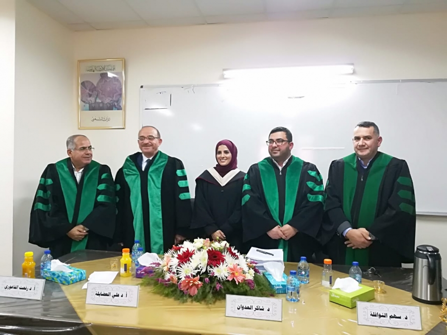 وتألفت لجنة المناقشة من الدكتور رفعت الفاعوري، والدكتور سهم النوافلة كعضوين داخليين، والدكتور علي العضايلة عضوا خارجيا من جامعة مؤته.