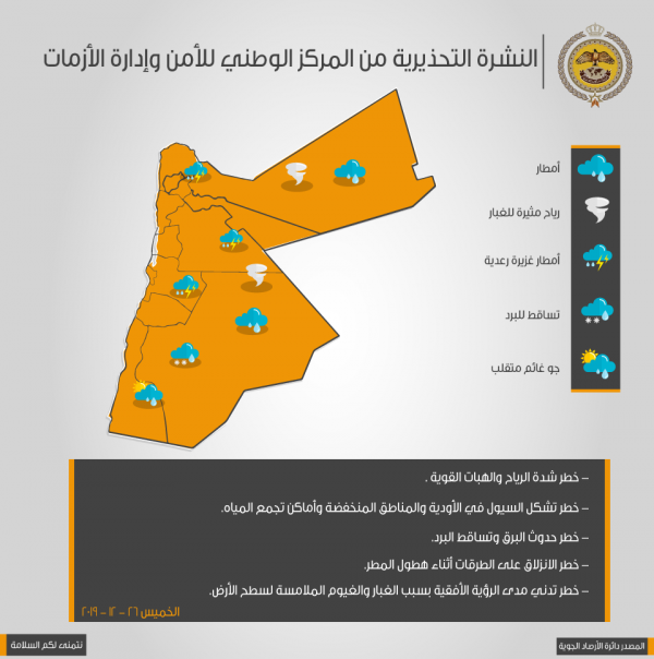- نشر المركز الوطني لادارة الازمات خارطة مخاطر الحالة الجوية لليوم الخميس.