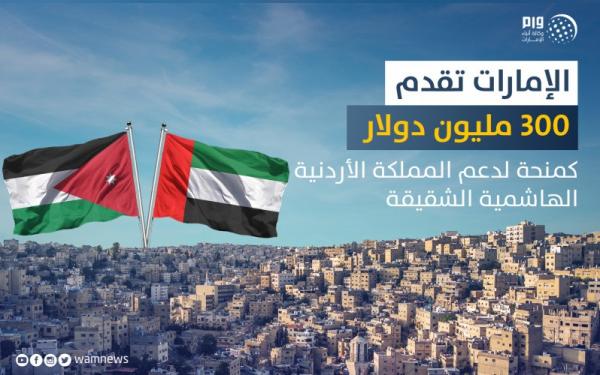 قالت وكالة الانباء الاماراتية إنه بناء على توجيهات الشيخ خليفة بن زايد آل نهيان رئيس دولة الامارات العربية المتحدة وبدعم الشيخ محمد بن زايد آل نهيان ولي عهد أبوظبي نائب القائد الأعلى للقوات المسلحة ومتابعة الشيخ منصور بن زايد آل نهيان نائب رئيس مجلس الوزراء وزير شؤون الرئاسة رئيس مجلس إدارة صندوق أبوظبي للتنمية أعلنت دولة الإمارات عن تقديم 300 مليون دولار دعما للأردن عبر صندوق أبوظبي للتنمية.