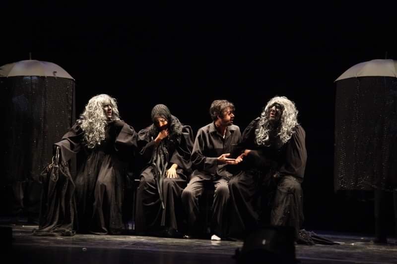 الحوارية شملت قول حمد أشكناني الممثل الرئيسي في المسرحية "أنا موجود"، لترد عليه الجوقة "أنت تعاني من أزمة وجود".