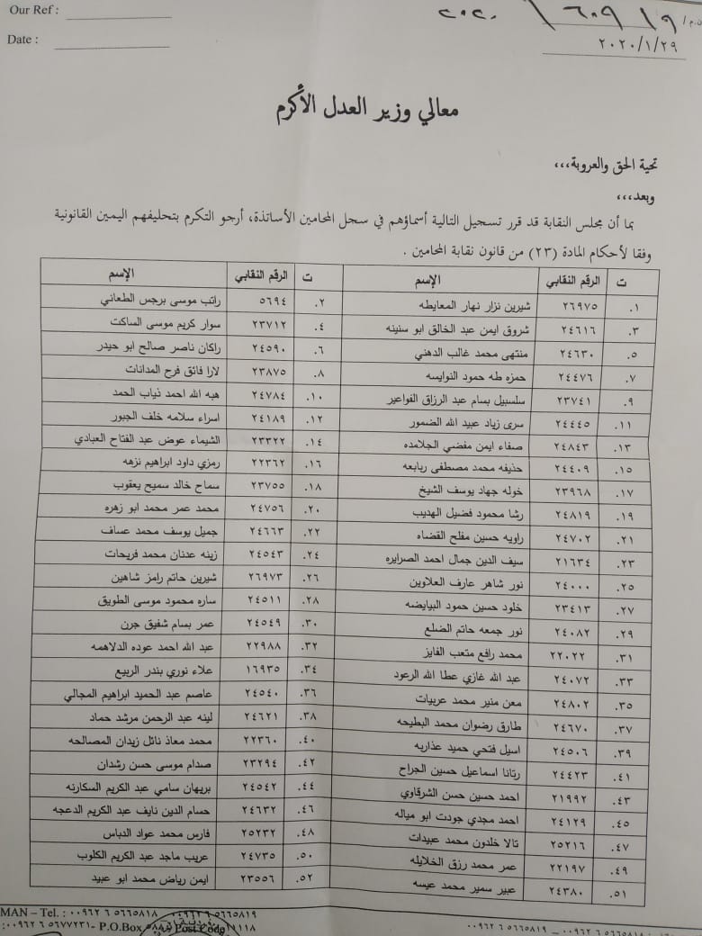 يشار الى ان المادة 23 من قانون نقابة المحامين تلزم المحامي الذي يسجل اسمه لاول مرة في سجل المحامين ان يحلف اليمين القانونية أمام وزير العدل بحضور نقيب المحامين او عضوين من مجلس النقابة .