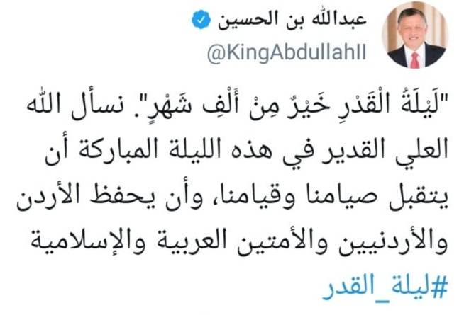 نشر جلالة الملك عبدالله الثاني، تغريدة على تويتر قال فيها: لَيْلَةُ الْقَدْرِ خَيْرٌ مِنْ أَلْفِ شَهْرٍ . نسأل الله العلي القدير في هذه الليلة المباركة أن يتقبل صيامنا وقيامنا، وأن يحفظ الأردن والأردنيين والأمتين العربية والإسلامية
