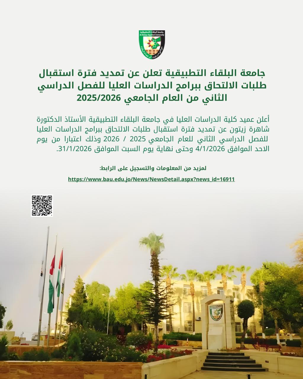 جامعة البلقاء التطبيقية تعلن عن تمديد فترة استقبال طلبات الالتحاق ببرامج الدراسات العليا للفصل الدراسي الثاني من العام الجامعي 2025/2026