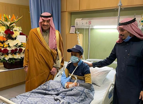 السديري يعود الطفل السعودي غازي الشراري الذي تعرض لحادث سقوط نتيجة انزلاقه في الثلج
