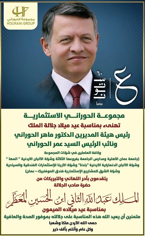 مجموعة الحوراني الاستثمارية تهنىء بمناسبة عيد ميلاد جلالة الملك
