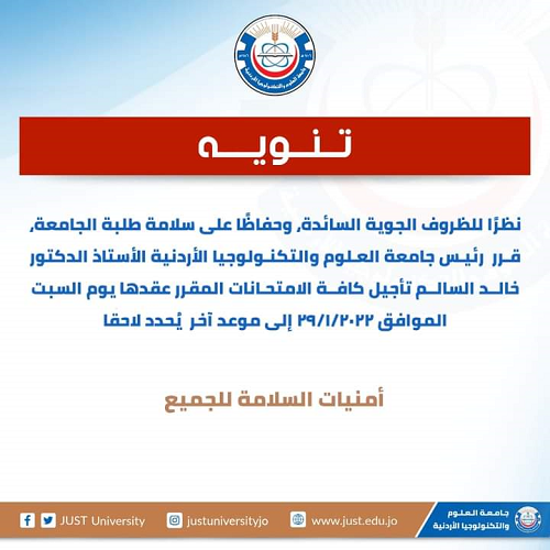العلوم والتكنولوجيا الأردنية تقرر تأجيل كافة الامتحانات المقرر عقدها يوم السبت
