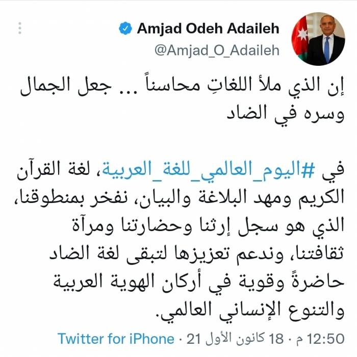 تغريدة السفير الأردني في القاهرة أمجد العضايلة بمناسبة اليوم العالمي للغة العربية.