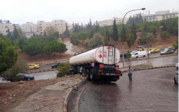 انزلاق صهريج بترول وخروجه عن مساره على شارع الأردن