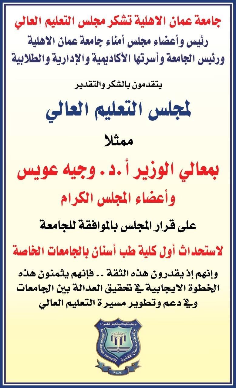 • جامعة عمان الاهلية تشكر مجلس التعليم العالي