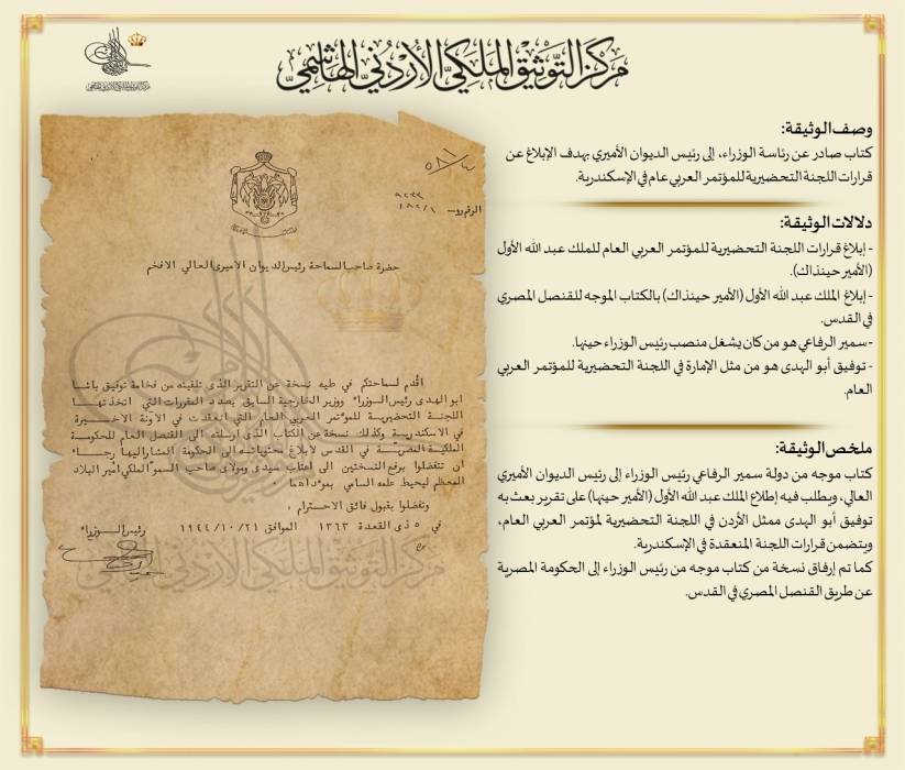 التوثيق الملكي يعرض وثيقة بمناسبة انعقاد اللجنة التحضيرية للمؤتمر العربي