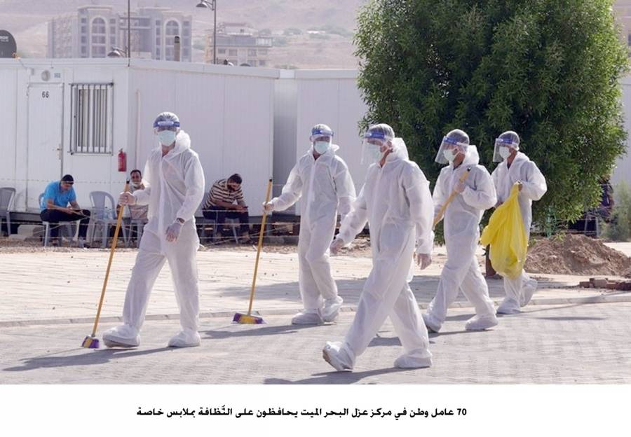 70 عامل وطن في مركز عزل البحر الميت يحافظون على النَّظافة بملابس خاصة