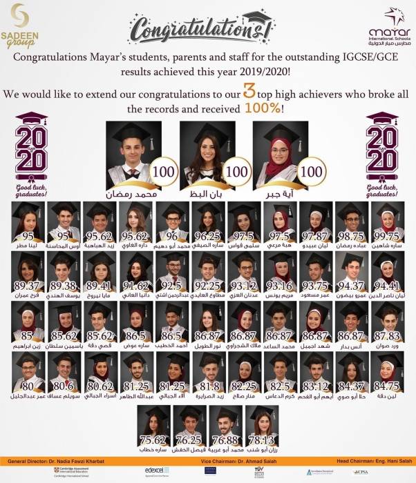 طلبة مدارس ميار الدولية يحصلون على معدل 100% في الثانوية العامة
