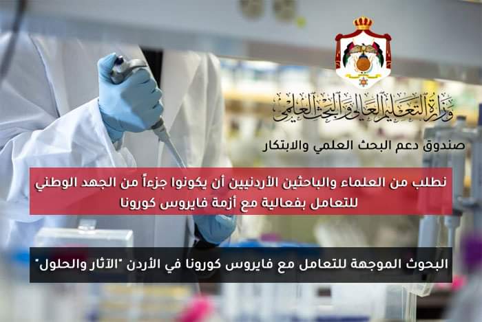 • صندوق دعم البحث العلمي في وزارة التعليم العالي يستقبل البحوث الموجهة للتعامل كورونا في الأردن