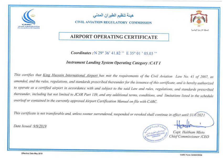 الطيران المدني تجدد ترخيص مطار الملك حسين الدولي