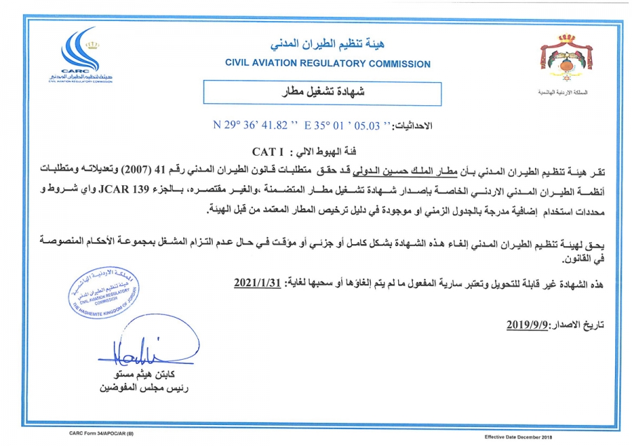 هيئة تنظيم الطيران المدني تجدد ترخيص مطار الملك حسين الدولي في العقبة