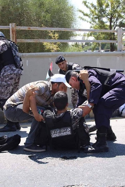 صورة رجل أمن ومعلم يساعدان دركي سقط بفعل الغاز المسيل للدموع