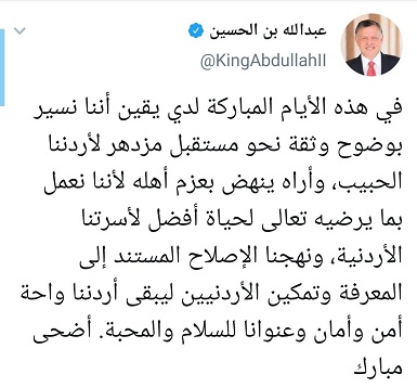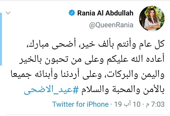 الملكة رانيا عبر تويتر تبارك بمناسبة عيد الأضحى المبارك