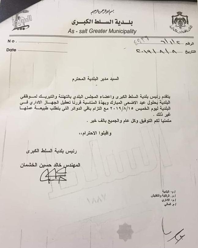 بلدية السلط الكبرى تمدد عطلة عيد الأضحى المبارك