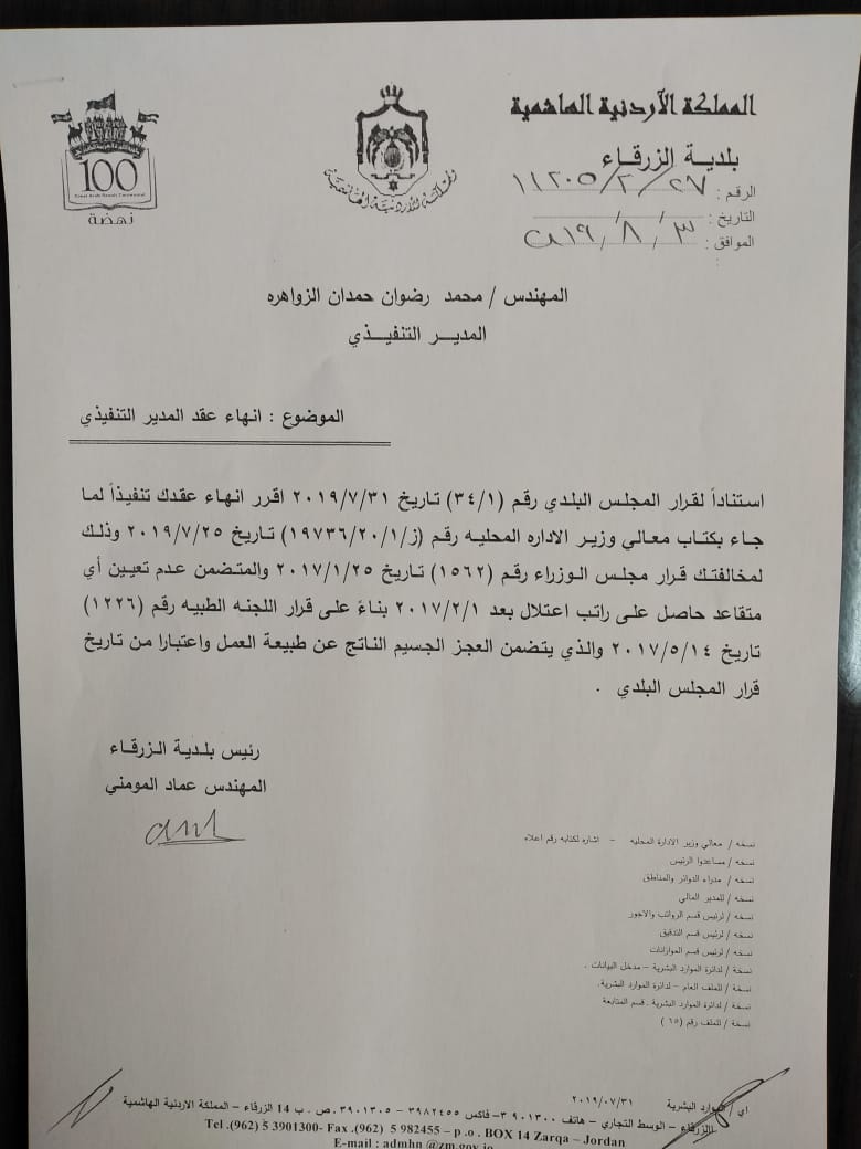مجلس بلدي الزرقاء ينهي عقد المدير التنفيذي بسبب مخالفته لقرار مجلس الوزراء بعدم تعيين اي موظف حاصل على معلولية