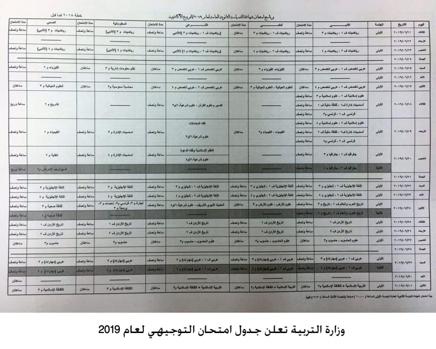 "التربية" تعلن جدول امتحانات الثانوية العامة لعام 2019