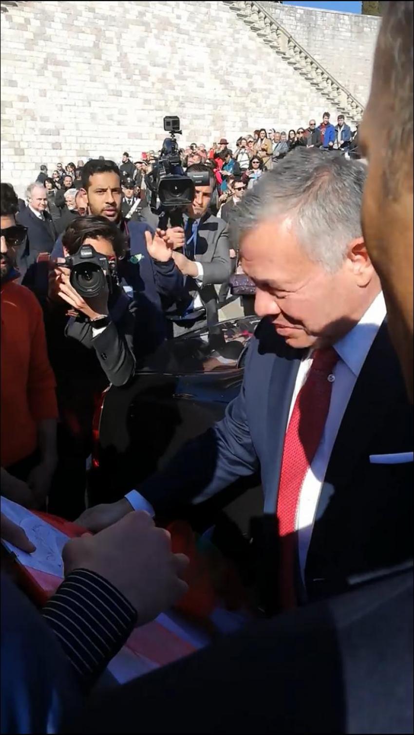 • الملك يترجل من سيارته بعد تسلمه جائزة مصباح السلام لاجل شابين سوريين