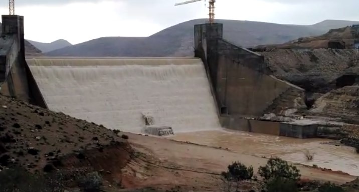 المياه فيضان المياه من سد الموجب بعد امتلائه للمرة الاولى