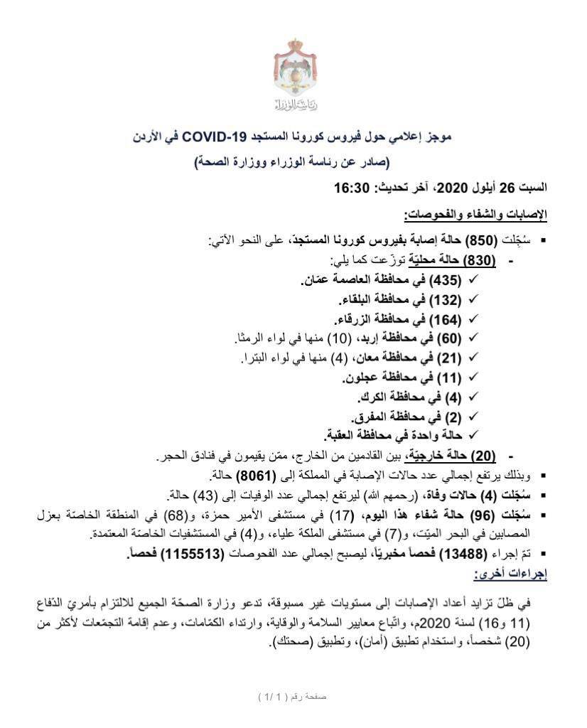 الإصابات والشفاء والفحوصات: ▪ سُجِّلت (850) حالة إصابة بفيروس كورونا المستجدّ، على النحو الآتي: - (830) حالة محليّة توزّعت كما يلي: ✓ (435) في محافظة العاصمة عمّان. ✓ (132) في محافظة البلقاء. ✓ (164) في محافظة الزرقاء. ✓ (60) في محافظة إربد، (10) منها في لواء الرمثا. ✓ (21) في محافظة معان، (4) منها في لواء البترا. ✓ (11) في محافظة عجلون. ✓ (4) في محافظة الكرك. ✓ (2) في محافظة المفرق. ✓ حالة واحدة في محافظة العقبة. - (20) حالة خارجيّة، بين القادمين من الخارج، ممّن يقيمون في فنادق الحجر. ▪ وبذلك يرتفع إجمالي عدد حالات الإصابة في المملكة إلى (8061) حالة. ▪ سُجّلت (4) حالات وفاة، (رحمهم الله) ليرتفع إجمالي عدد الوفيات إلى (43) حالة. ▪ سُجّلت (96) حالة شفاء هذا اليوم، (17) في مستشفى الأمير حمزة، و(68) في المنطقة الخاصّة بعزل المصابين في البحر الميّت، و(7) في مستشفى الملكة علياء، و(4) في المستشفيات الخاصّة المعتمدة. ▪ تمّ إجراء (13488) فحصاً مخبريّاً، ليصبح إجمالي عدد الفحوصات (1155513) فحصاً. إجراءات أخرى: في ظلّ تزايد أعداد الإصابات إلى مستويات غير مسبوقة، تدعو وزارة الصحّة الجميع للالتزام بأمريّ الدّفاع (11 و16) لسنة 2020م، واتّباع معايير السلامة والوقاية، وارتداء الكمّامات، وعدم إقامة التجمّعات لأكثر من (20) شخصاً، واستخدام تطبيق (أمان)، وتطبيق (صحتك).