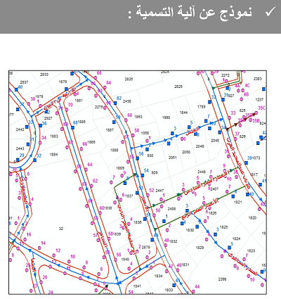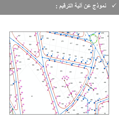 ترقيم قطع الأراضي على امتداد الشوارع من اليمين ترقيم زوجي و من اليسار ترقيم فردي و إتجاه الترقيم لبداية الشارع بدلالة إتجاه السهم المشار إليه على لوحة الجداريات