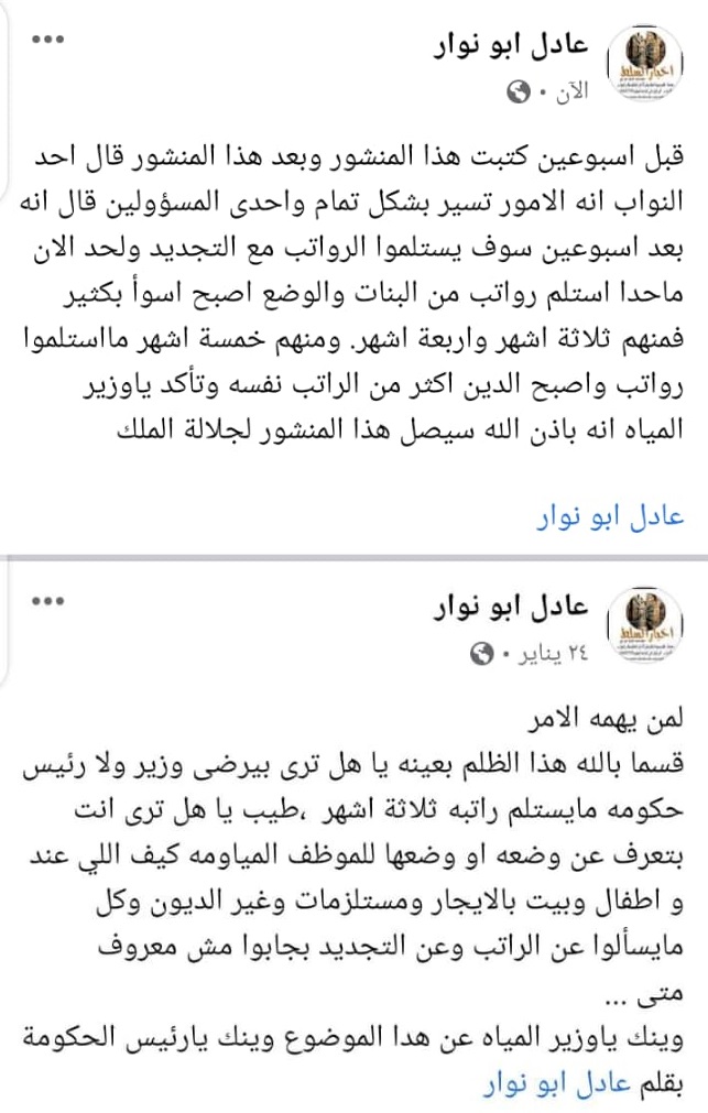 وقال ابو نوار في منشور له عبر فيسبوك، إنه كتب قبل اسبوعين حول مشكلة هؤلاء العاملي، وعلى اثر ذلك قال احد النواب ان الامور تسير بشكل "تمام"، فيما أكد مسؤول أن الرواتب ستصرف بعد اسبوعين مع التجديد، ولكن حتى الان لم ينفذ ذلك.