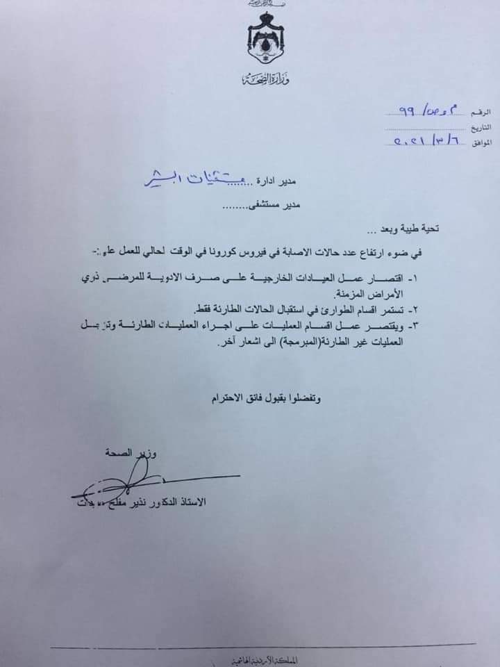 ووجه عبيدات كتابا الى مدراء الادارات والمستشفيات لاقتصار العمل في العيادات الخارجية واستمرار عمل اقسام الطوارئ في استقبال الحالات الطارئة فقط واجراء العمليات الطارئة فقط في اقسام العمليات وحتى اشعار اخر.