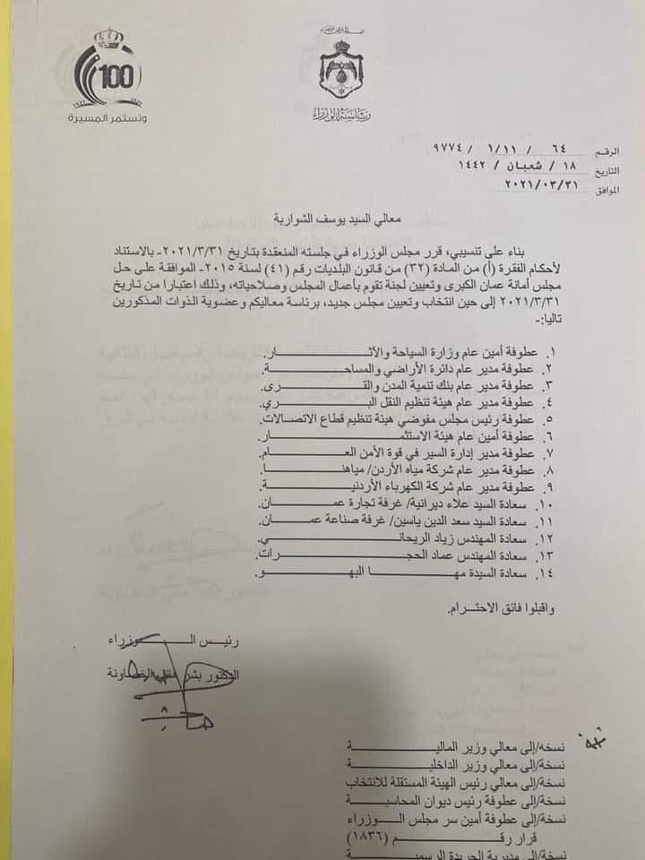 قرر دولة رئيس الوزراء تعين لجنة أمانة عمان المؤقتة