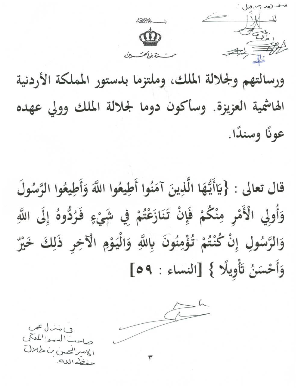 وفي ضوء تطورات اليومين الماضيين، فإنني أضع نفسي بين يدي جلالة الملك، مؤكدا أنني سأبقى على عهد الآباء والأجداد، وفيا لإرثهم، سائرا على دربهم، مخلصا لمسيرتهم ورسالتهم ولجلالة الملك، وملتزما بدستور المملكة الأردنية الهاشمية العزيزة. وسأكون دوما لجلالة الملك وولي عهده عونا وسندا.