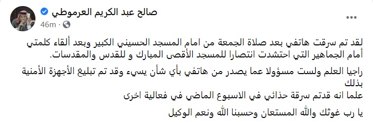 أعلن النائب صالح العرموطي الجمعة، عن سرقة هاتفه بعد صلاة الجمعة، من أمام المسجد الحسيني الكبير وبعد القاء كلمته أمام الجماهير التي احتشدت انتصارا للمسجد الأقصى المبارك و للقدس والمقدسات.
