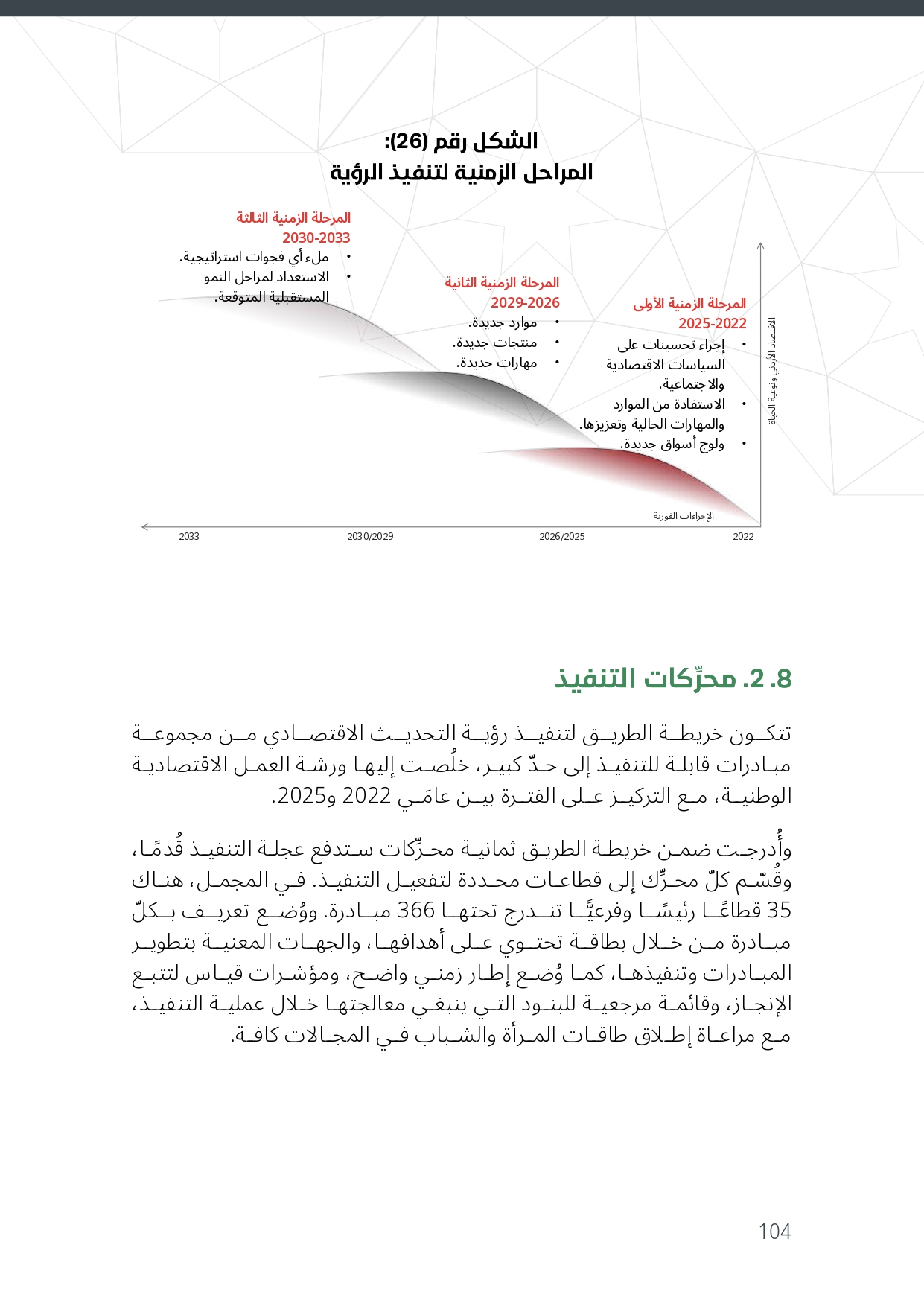 وتعتمد رؤية التحديث الاقتصادي 2033 على ركيزتين رئيسيين، هما: ركيزة النمو الاقتصادي (إطلاق كامل الإمكانات)، وركيزة جودة الحياة (النهوض بنوعية الحياة)، حيث تتشارك الركيزتان بخاصية "الاستدامة”.