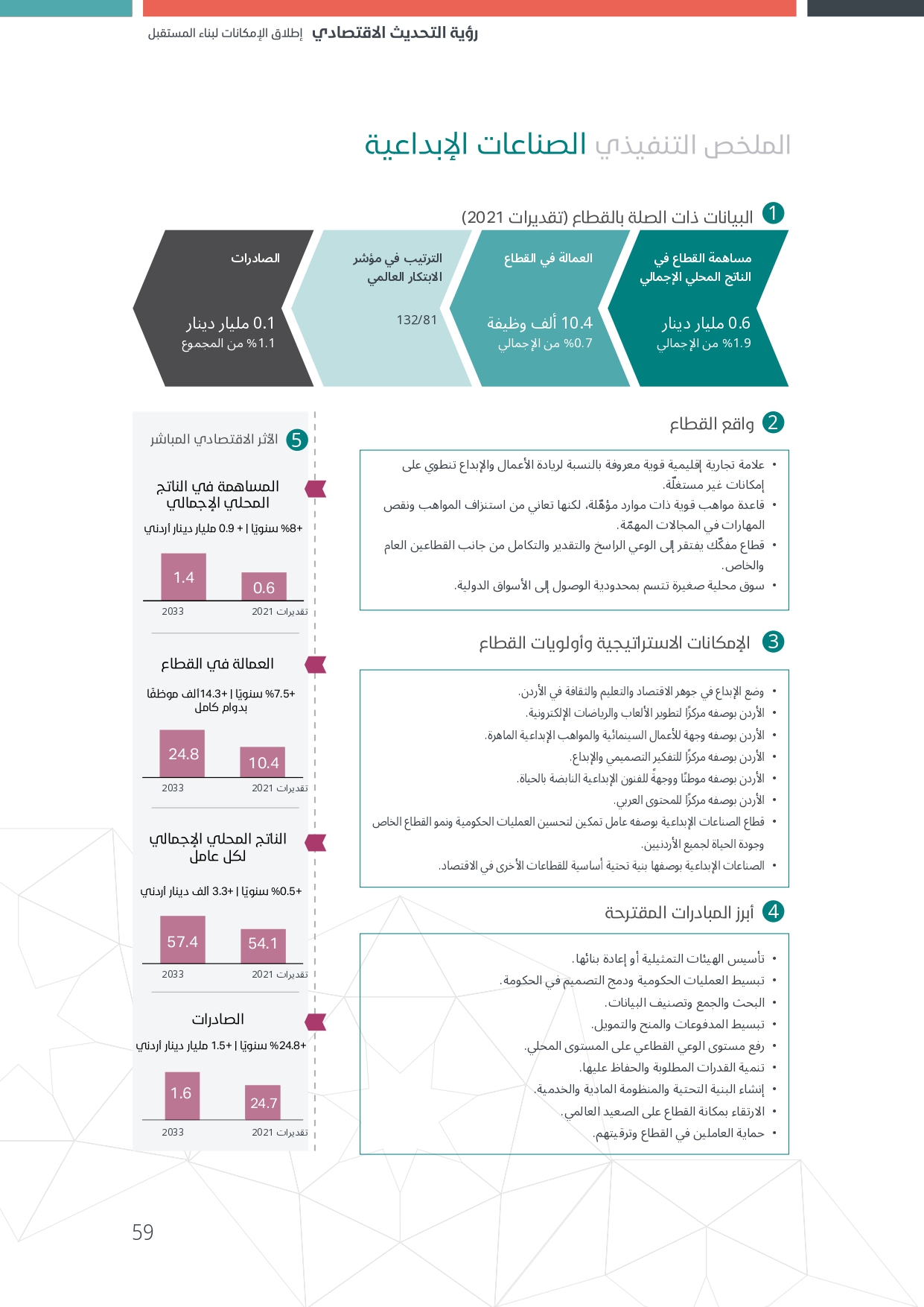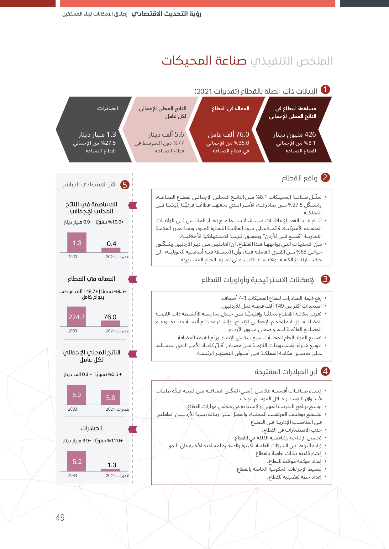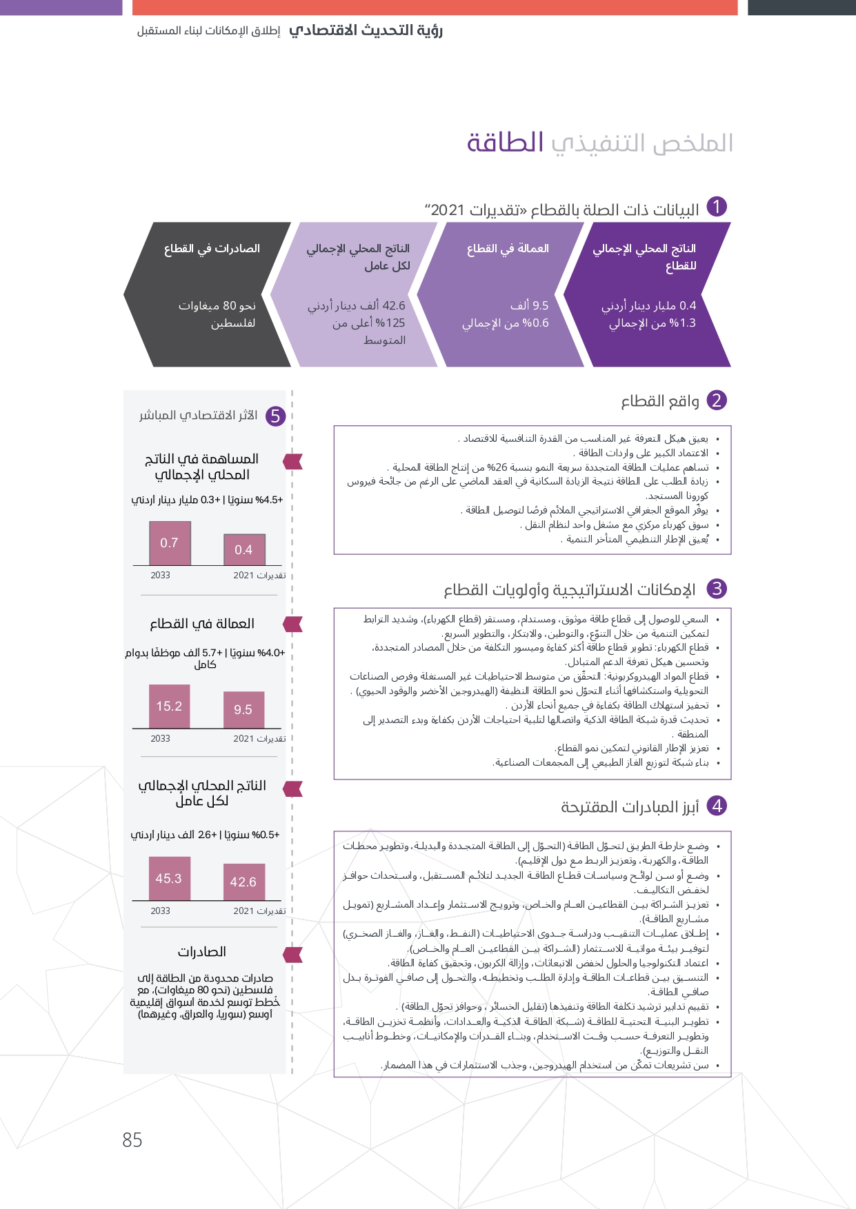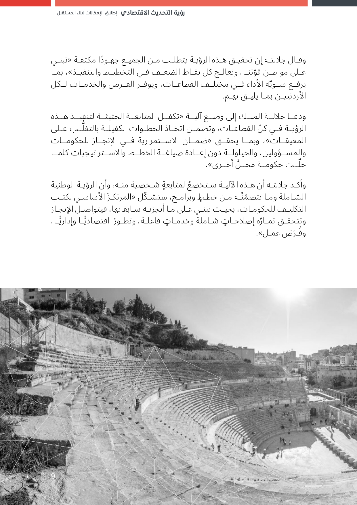ويمكن للأردن أن يحقق من خلال الركيزة الأولى قفزات نوعية في النمو الاقتصادي واستحداث فرص عمل خلال العقد المقبل، مع النموّ المستمر لصافي دخل الأفراد، وأن يصل من خلال الركيزة الثانية إلى تحسين نوعية الحياة بشكل ملموس ليكون في طليعة دول المنطقة في هذا المضمار.