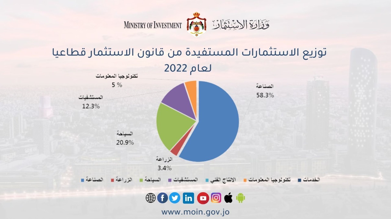 ووضحت الوزارة في بيانها، أن حجم الاستثمارات المحلية والأجنبية المستفيدة من قانون الاستثمار شهد ارتفاعاً ملموساً خلال عام 2022، فارتفع الاستثمار المحلي بنسبة 76.9% ليصل الى 976.3 مليون دينار، بينما الاستثمار الأجنبي ارتفع بنسبة 98.3% ليصل الى 137 مليون دينار أردني.