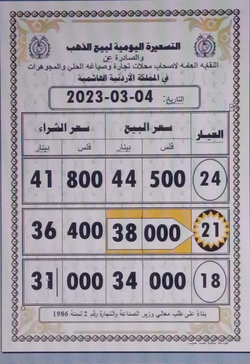 وبلغ سعر جرام الذهب عيار 21 الأكثر طلبا من قبل الأردنيين 38.00 دينارا لجهة الشراء من المحلات و 36.40 دينارا لجهة البيع.