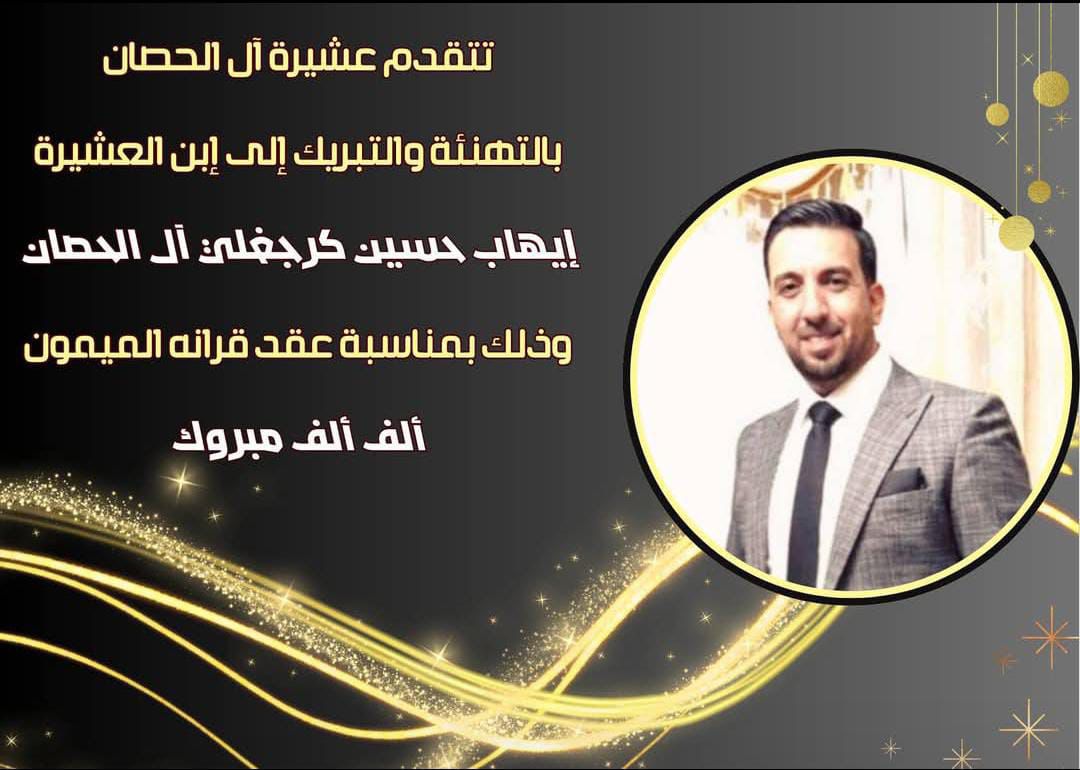 بالتهنئة والتبريك إلى إبن العشيرة إيهاب حسين كرجغلي آل الحصان