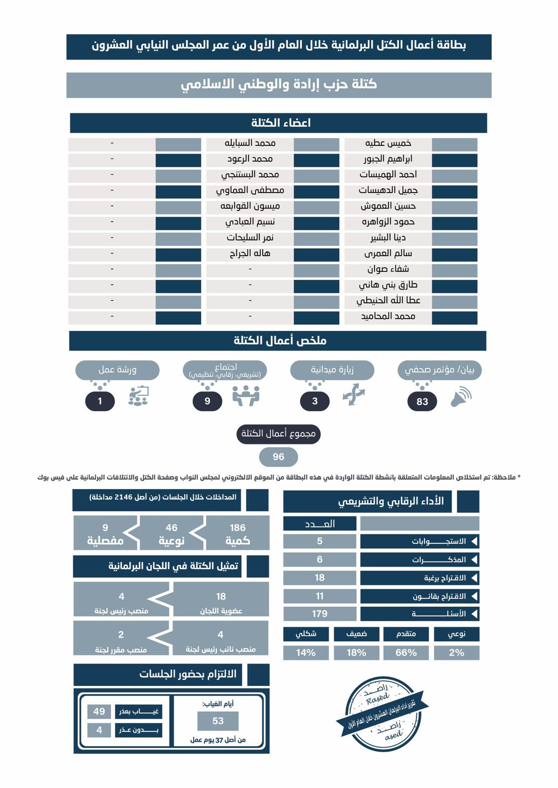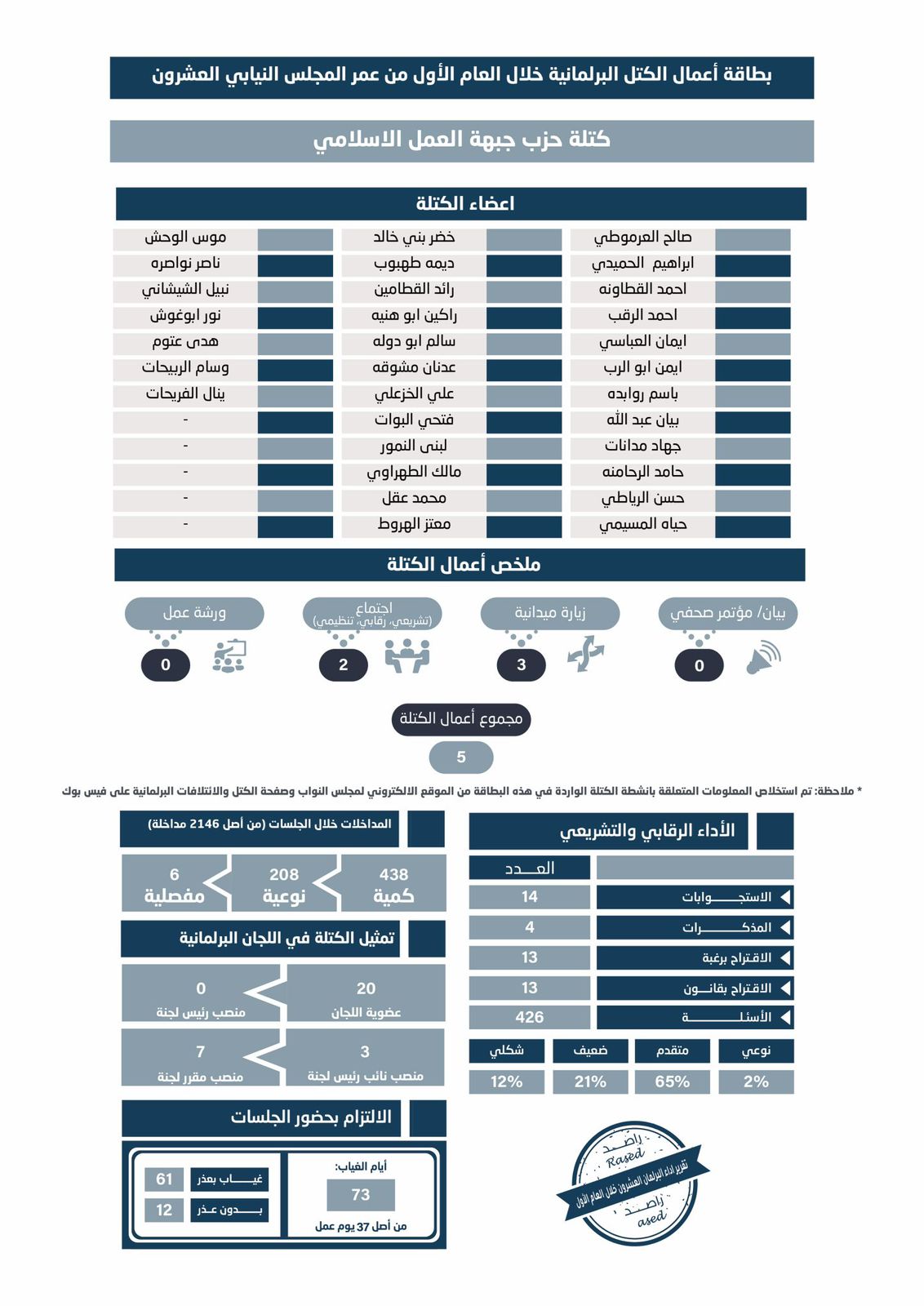 كتلة جبهة العمل الإسلامي الأعلى التزاماً بحضور الجلسات والوسطية الأعلى غياباً.