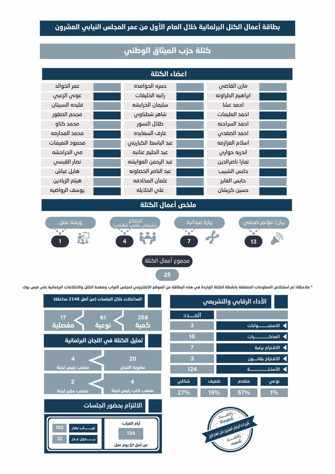 وبتحليل البيانات المرتبطة بأداء الكتل البرلمانية يتبين أن عدد الأنشطة والفعاليات والبيانات والزيارات التي نقذتها الكتل البرلمانية وصلت إلى 321 نشاطاً وفعالية وبياناً وزيارة، حيث كانت كتلة عزم الأعلى بتعداد الأنشطة بواقع 127 نشاطاً منهم 13 اجتماعاً و86 بياناً أو مؤتمراً صحفياً و20 زيارة ميدانية و8 ورشات عمل، تلتها كتلة حزب إرادة والوطني الإسلامي بواقع 96 نشاطاً، منهم 9 اجتماعات و83 بياناً أو مؤتمراً صحفياً و3 زيارات ميدانية وورشة عمل واحدة، تلاهم كتلة اتحاد الأحزاب الوسطية حيث نفذوا 39 نشاطاً منهم 4 اجتماعات و25 بياناً أو مؤتمراً صحفياً و9 زيارات ميدانية وورشة عمل واحدة، يليهم كتلة تقدم ب29 نشاطاً منهم 5 اجتماعات و22 بياناً أو مؤتمراً صحفياً وزيارة ميدانية وورشة عمل، ثم حزب الميثاق بـ 25 نشاطاً منهم 4 اجتماعات و13 بياناً أو مؤتمراً صحفياً و7 زيارات ميدانية وورشة عمل، ثم كتلة حزب جبهة العمل الإسلامي بـ 5 أنشطة منهم اجتماعين و3 زيارات ميدانية، علماً بأن المعلومات تم استخلاصها من الموقع الالكتروني لمجلس النواب وصفحة الكتل والائتلافات النيابية على الفيسبوك.