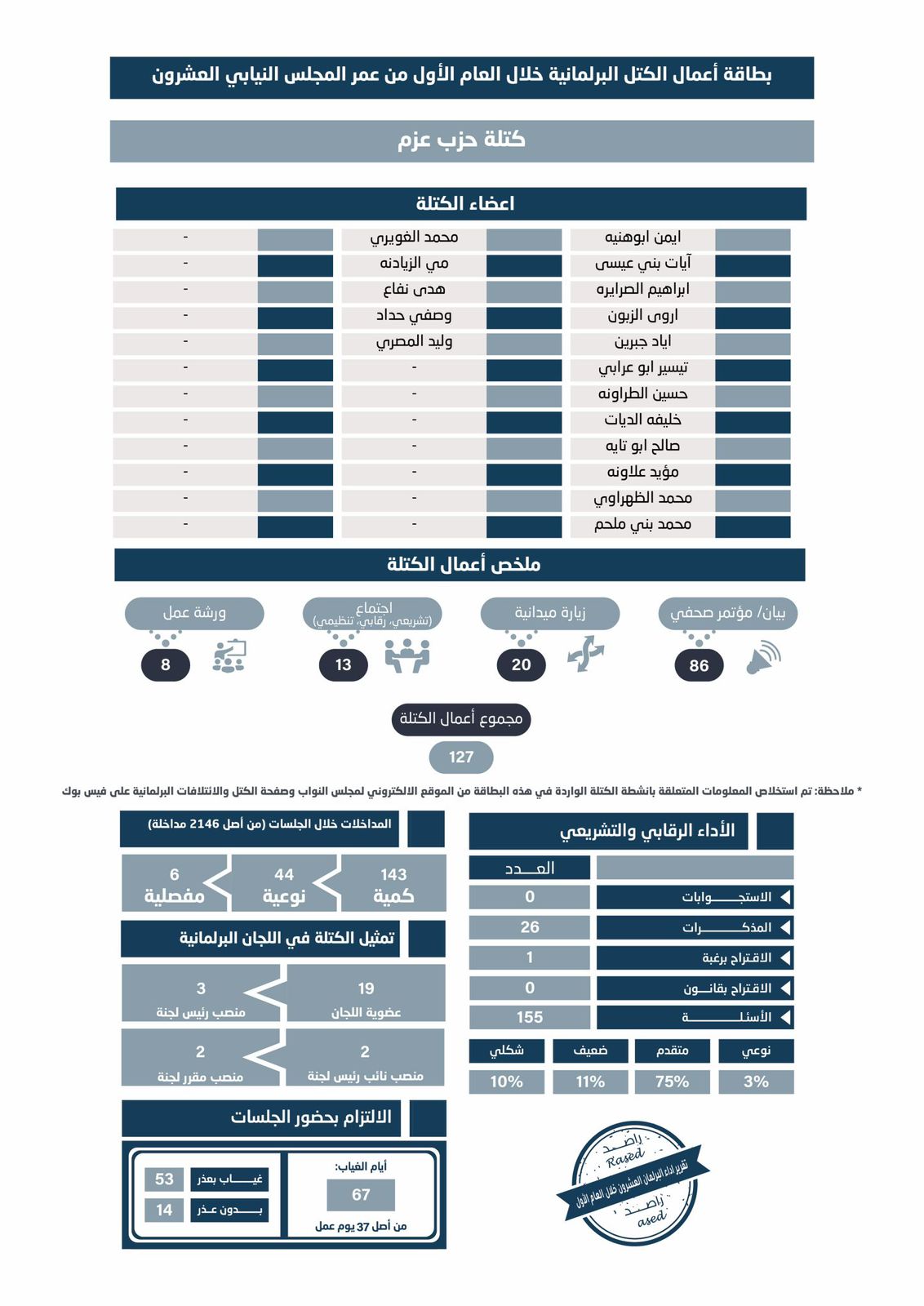 ويهدف راصد من خلال هذا الجزء من التقرير إلى تقديم صورة موضوعية وكمّية عن مدى فاعلية الكتل البرلمانية في ممارسة أدوارها التشريعية والرقابية والتمثيلية، بما يسهم في تعزيز الشفافية والمساءلة وتطوير الأداء البرلماني في الأردن.