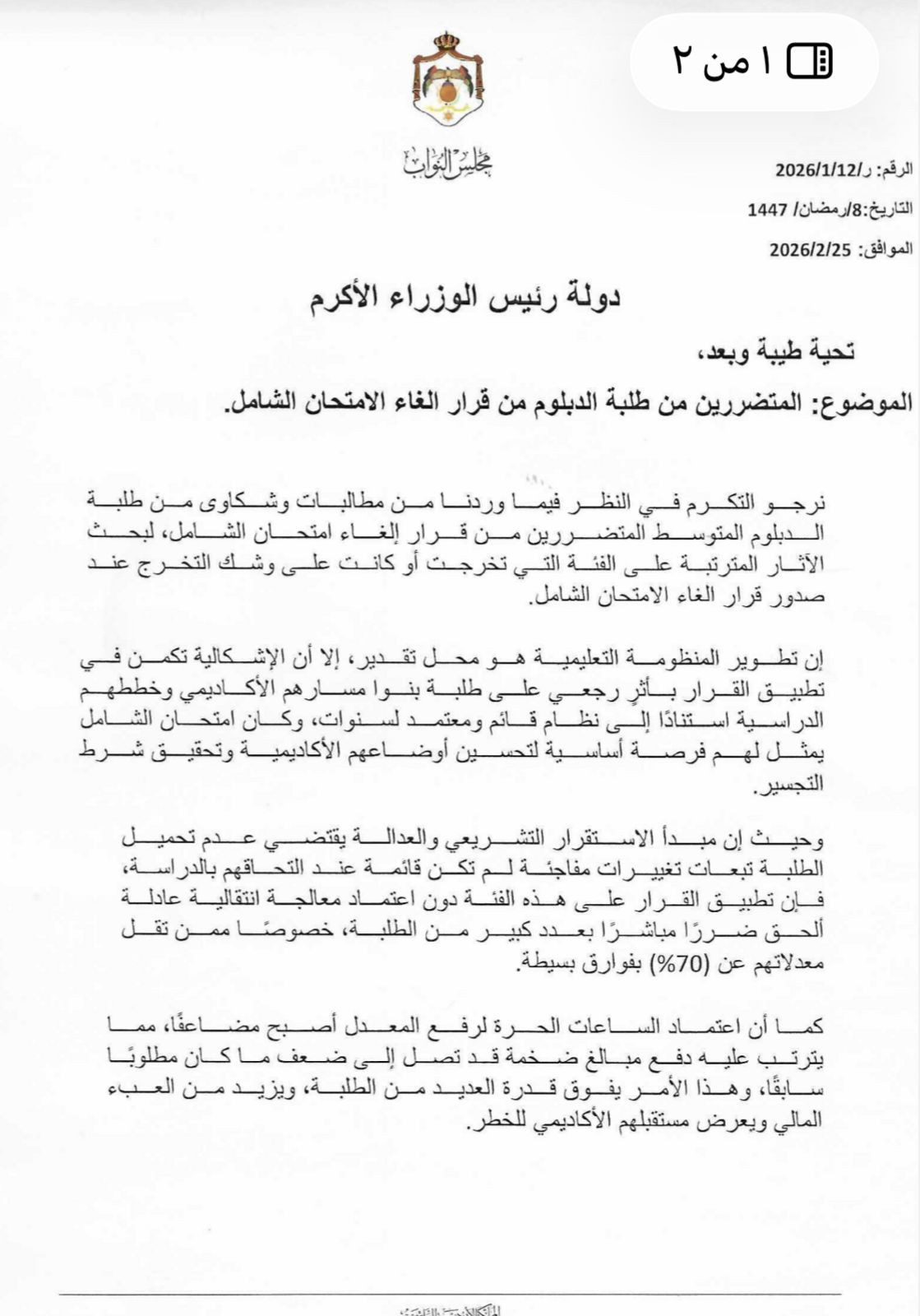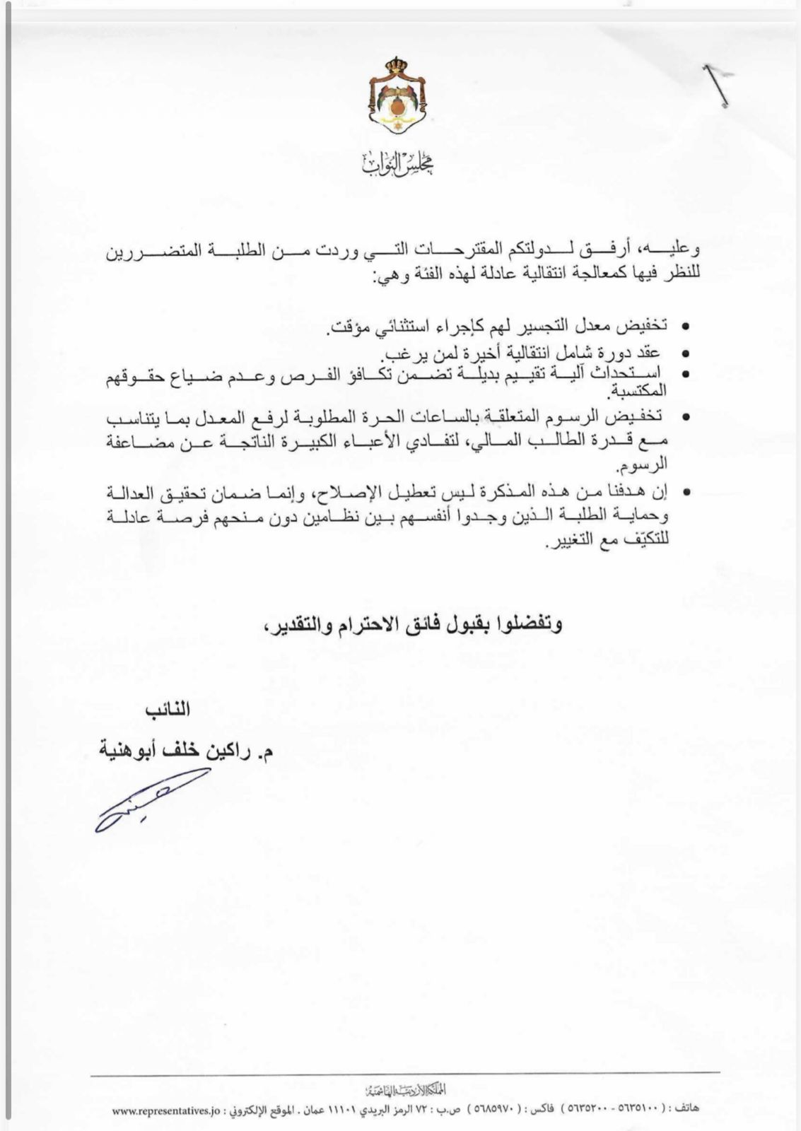 واختتم النائب مذكرته بالتأكيد على ضرورة إيجاد معالجة انتقالية منصفة توازن بين تطوير التعليم وصون حقوق الطلبة المتضررين