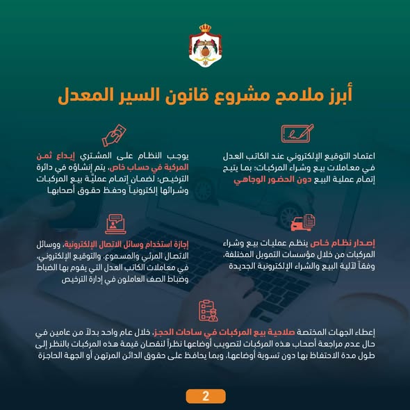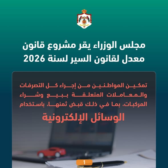 أقر مجلس الوزراء في جلسته التي عقدها اليوم الأربعاء، مشروع قانون معدِّل لقانون السَّير لسنة 2026؛ لغايات إتمام جميع إجراءات بيع وشراء المركبات إلكترونيَّاً دون الحاجة لمراجعة دوائر ترخيص السوَّاقين والمركبات.