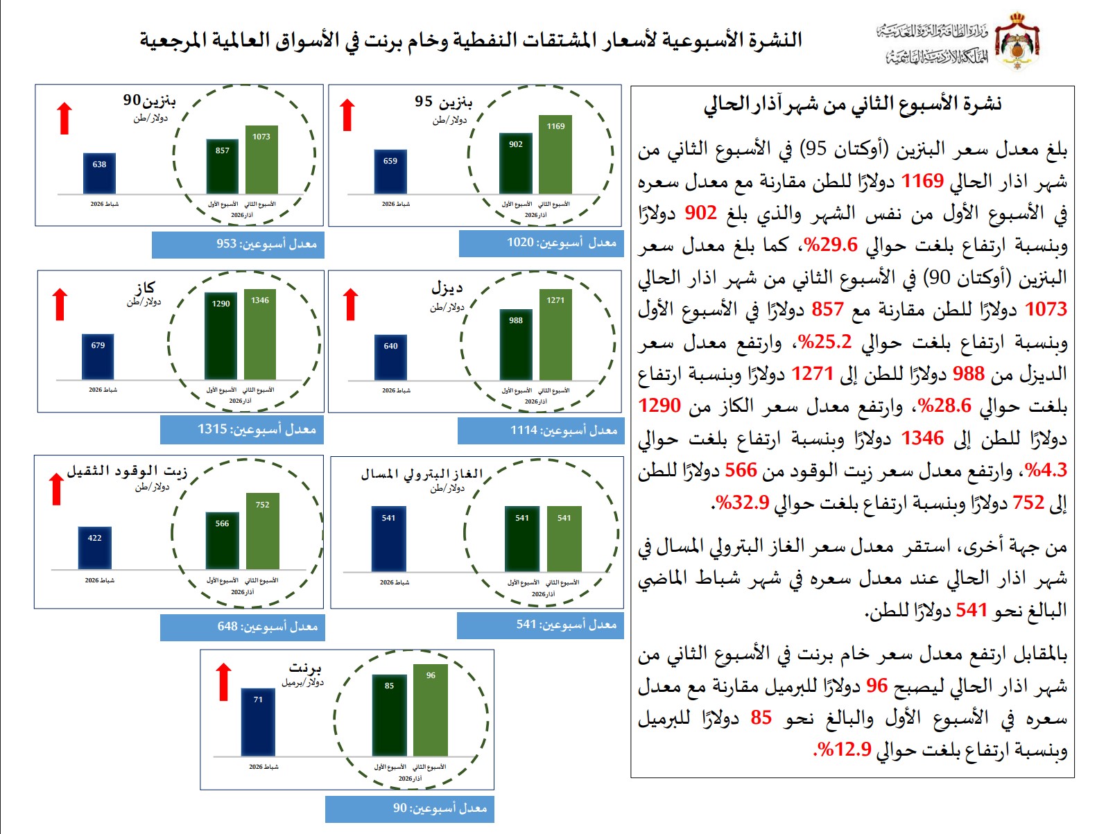 أما على صعيد النفط الخام، فقد ارتفع معدل سعر خام برنت في الأسبوع الثاني من آذار ليصل إلى 96 دولارا للبرميل، مقارنة مع 85 دولارا في الأسبوع الأول، بنسبة زيادة بلغت 12.9%.