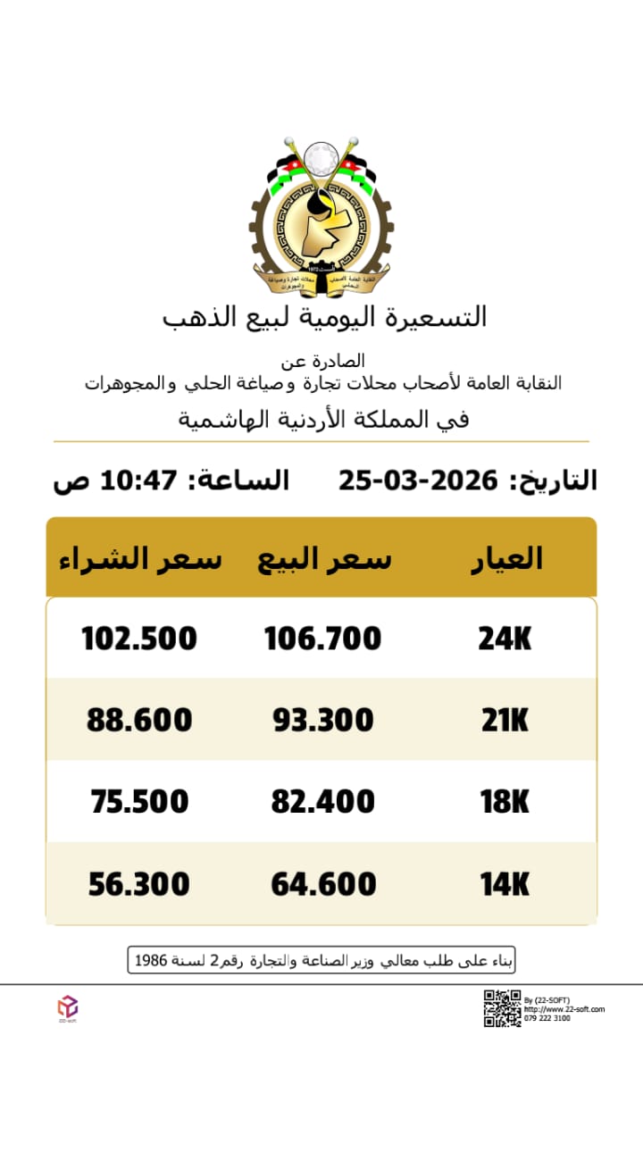 كما بلغ سعر بيع غرام الذهب من عيار 21، وهو الأكثر طلبا في السوق المحلية، 93.3 دينار مقابل 88.6 دينار للشراء.