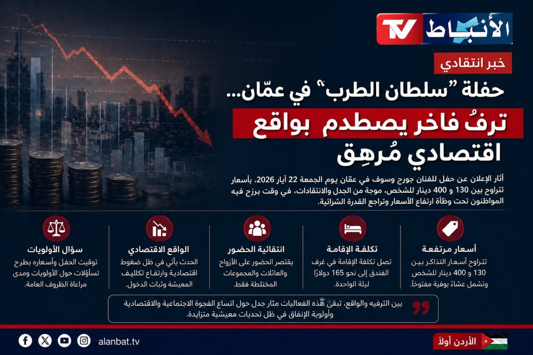 في وقتٍ يرزح فيه المواطن الأردني تحت وطأة الضغوط الاقتصادية وارتفاع تكاليف المعيشة، أثار الترويج لحفل الفنان جورج وسوف، المقرر إقامته في أحد فنادق العاصمة عمّان يوم الجمعة 22 أيار 2026، موجة من الجدل والتساؤلات حول توقيت الحدث وطبيعة أسعاره.