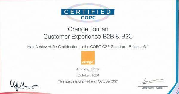 أورنج الأردن تحصد شهادة في مجال خدمة الزبائن
