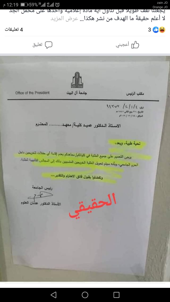 "آل البيت" تنفي صحة كتاب متداول حول حفلات التخرج