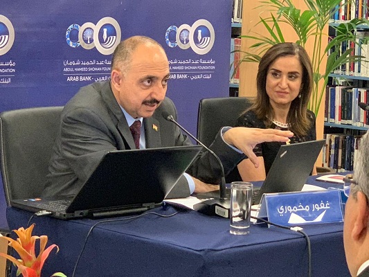 غفور مخموري في محاضرته في مكتبة عبدالحميد شومان